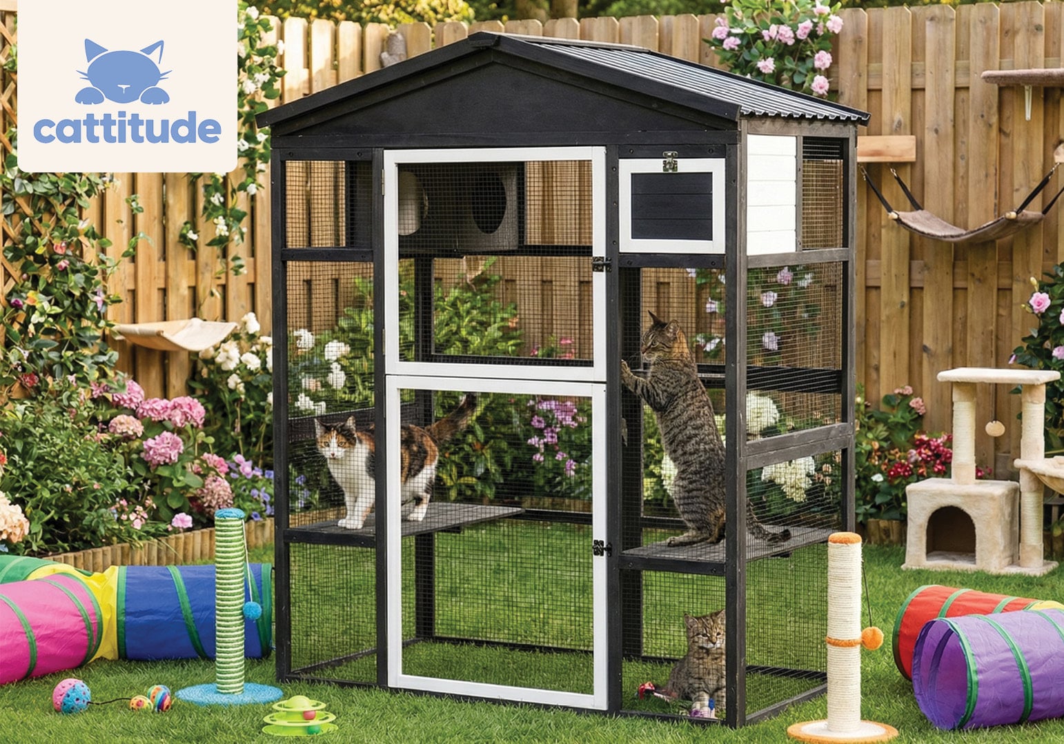 The Cattitude Catio Enclosure offers a spacious, customisable space with platforms and resting areas for climbing, jumping and sunbaking. It features dual safety doors, a durable waterproof PVC roof, and strong anti-predator mesh for cats and other small pets.😸 For more information, please contact your Allpet Sales Representative.